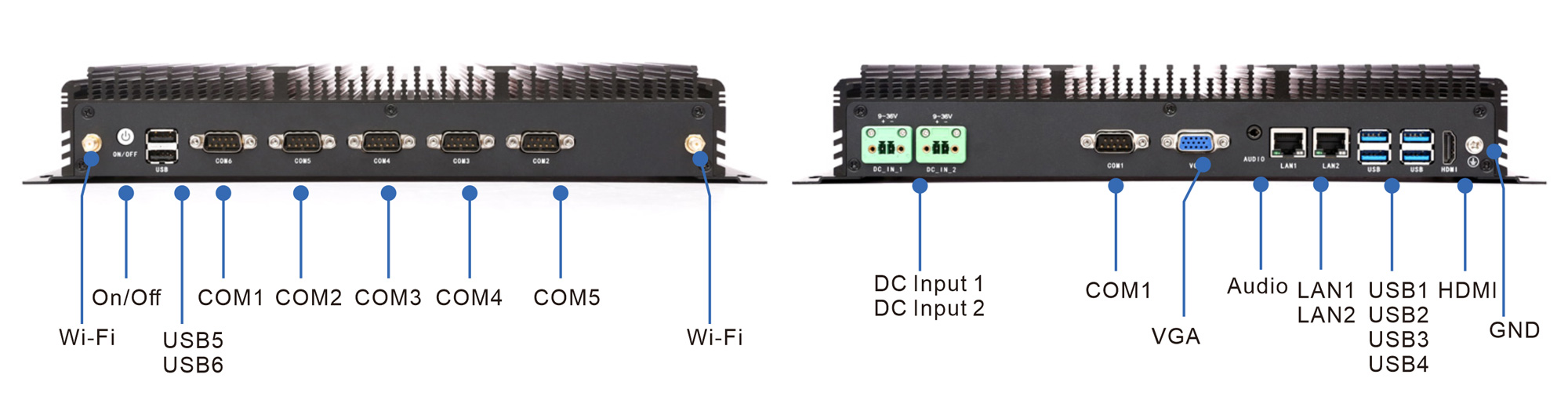 - 丰富接口:6×COM、2×千兆以太网口、6×USB、HDMI+VGA 双显输出,可轻松对接 PLC、传感器、摄像头、工业总线等多种外设。